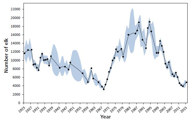 Wolven werden geherintroduceerd in het jaar 1995. Na het uitzetten van deze predatoren, kwam het landschap steeds meer tot bloei. Het begon allemaal toen de herten en elanden populatie voor het eerst in jaren daalden. In de grafiek hieronder zie je de gevolgen van de wolf op de populatie wapitiherten (elk in het Engels).