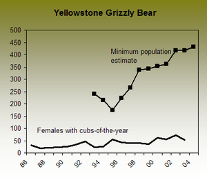 Grizzlyberen en coyotes zijn wel predatoren, maar coyotes jagen vooral op kleine dieren, want ze zijn te klein om op grote dieren (zoals bizons, elanden ect.) te jagen. Natuurlijk klopt het wel dat ze elanden en bizons aten maar ze jaagde niet op ze. En voor de wolven herintroductie waren er nauwelijks grizzlyberen, omdat het dieet van de grizzlybeer vooral bestaat uit wortels, bessen en noten. Dit was toendertijd erg problematisch in samenstelling met weinig vegetatie. Natuurlijk jaagden de grizzlyberen wel op elanden en gaffelbokken, maar dat was vaak niet mogelijk en dit was niet wat ze het liefst aten. Slechts 11% van het dieet van grizzlyberen bestaat uit zoogdieren en 67% bestaat uit plantensoorten. Je kan ook zien in deze grafiek dat er pas na de wolven herintroductie (in 1995) er meer beren in Yellowstone begonnen te komen.