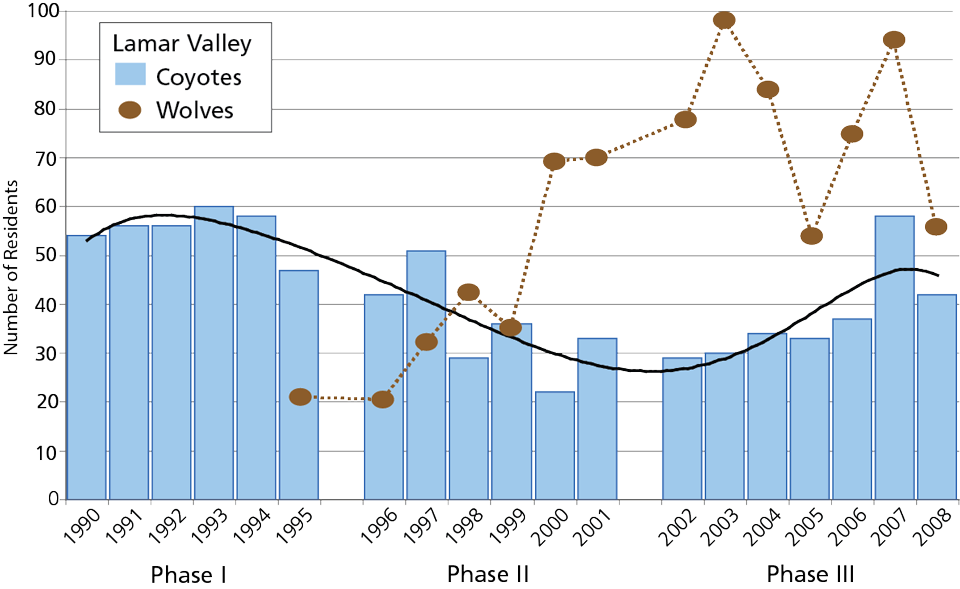Sinds 1995 zie je dat het gemiddelde aantal coyotes afneemt t/m 2002 en dan weer toeneemt, maar niet zo hoog als daarvoor. Je kan wel zien dat er in 2007 een hoge piek was, waar het aantal coyotes bijna de 60 raakte (net zoals 13 jaar geleden), maar het jaar daarop is het weer gedaald naar 41. Een grote oorzaak van het afnemen van coyotes, is dat er onder nu meer concurrentie ontstond tussen de coyotes zelf, omdat het voedsel voor de coyotes nu niet meer in overvloed is, moeten de coyotes meer en meer concurreren met elkaar om aan voedsel te komen. Dit zorgt uiteindelijk voor een beter aangepaste populatie coyotes.